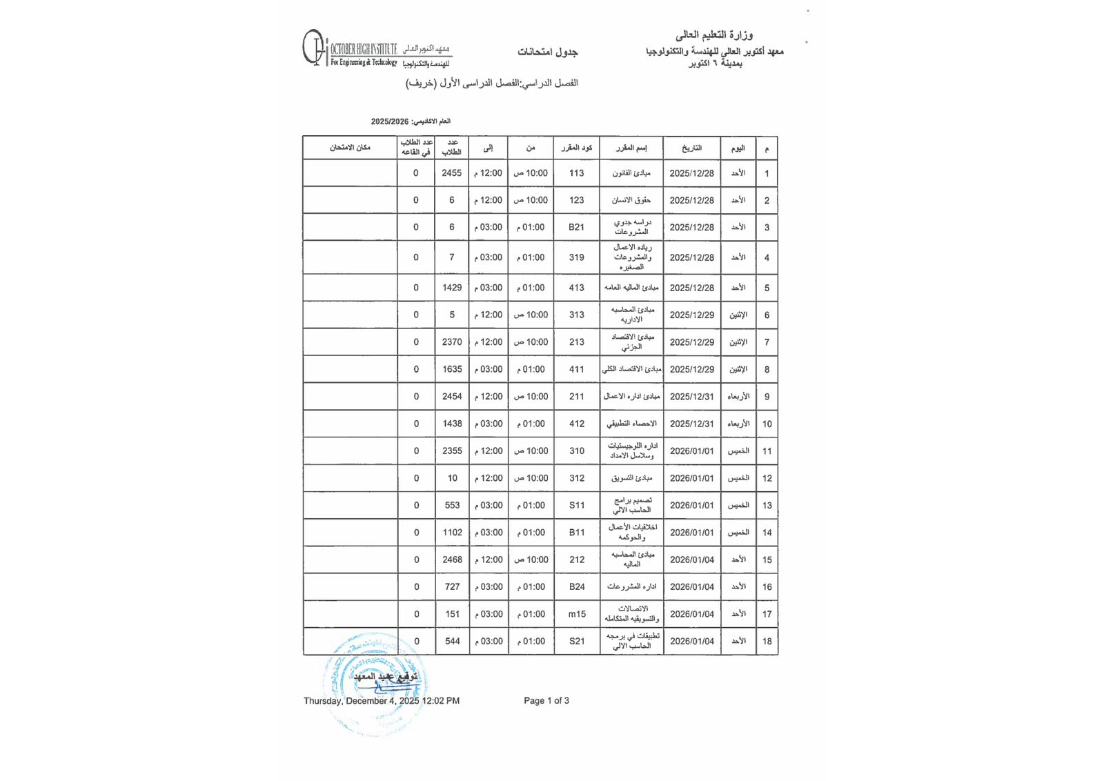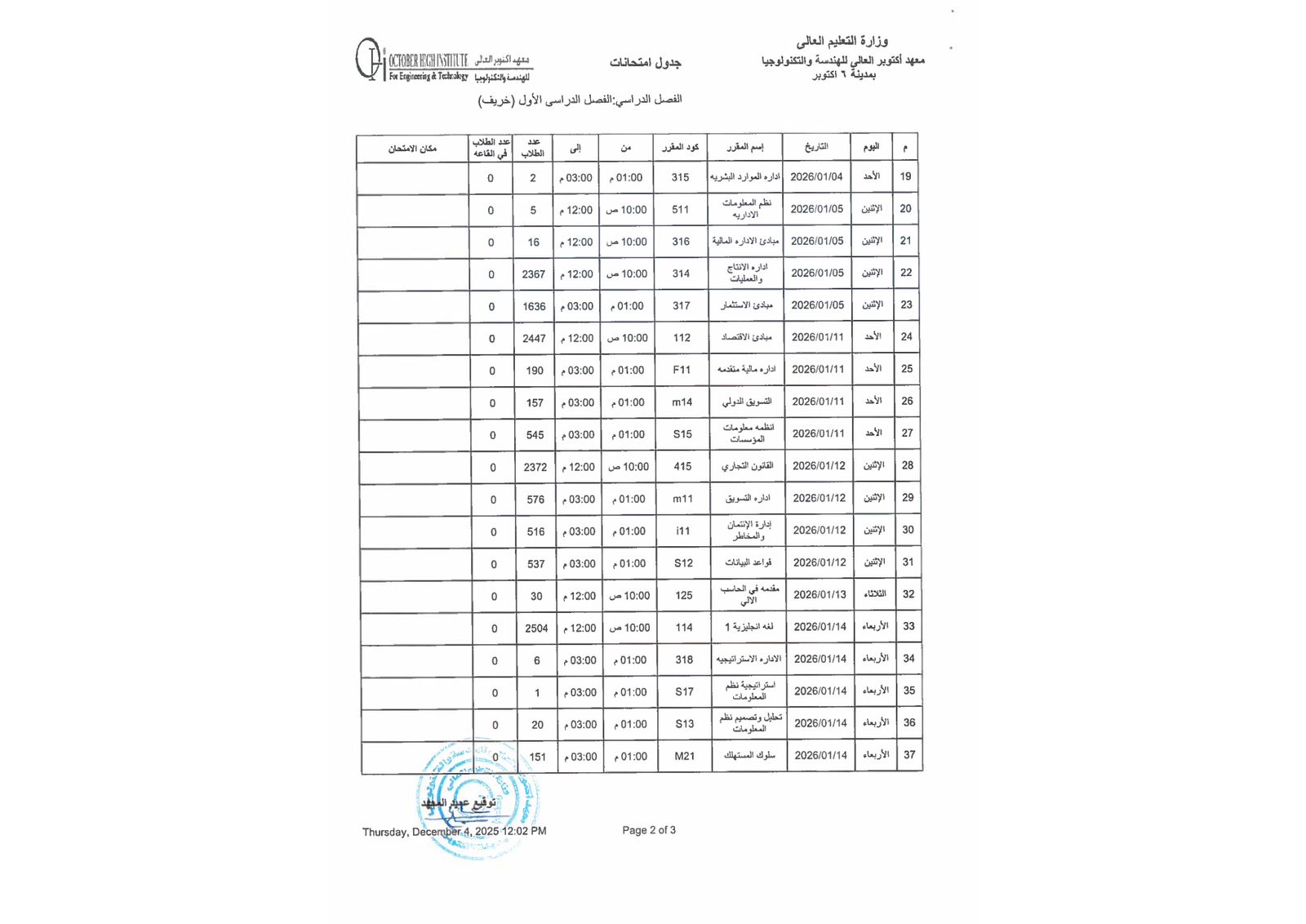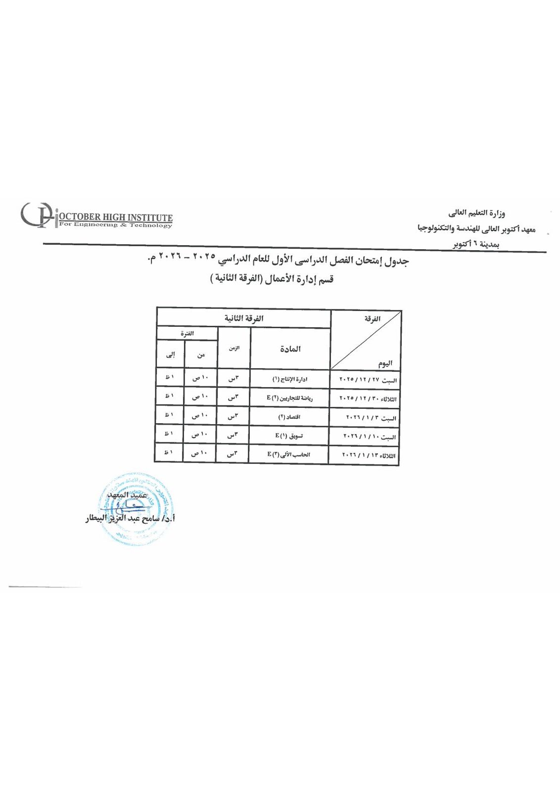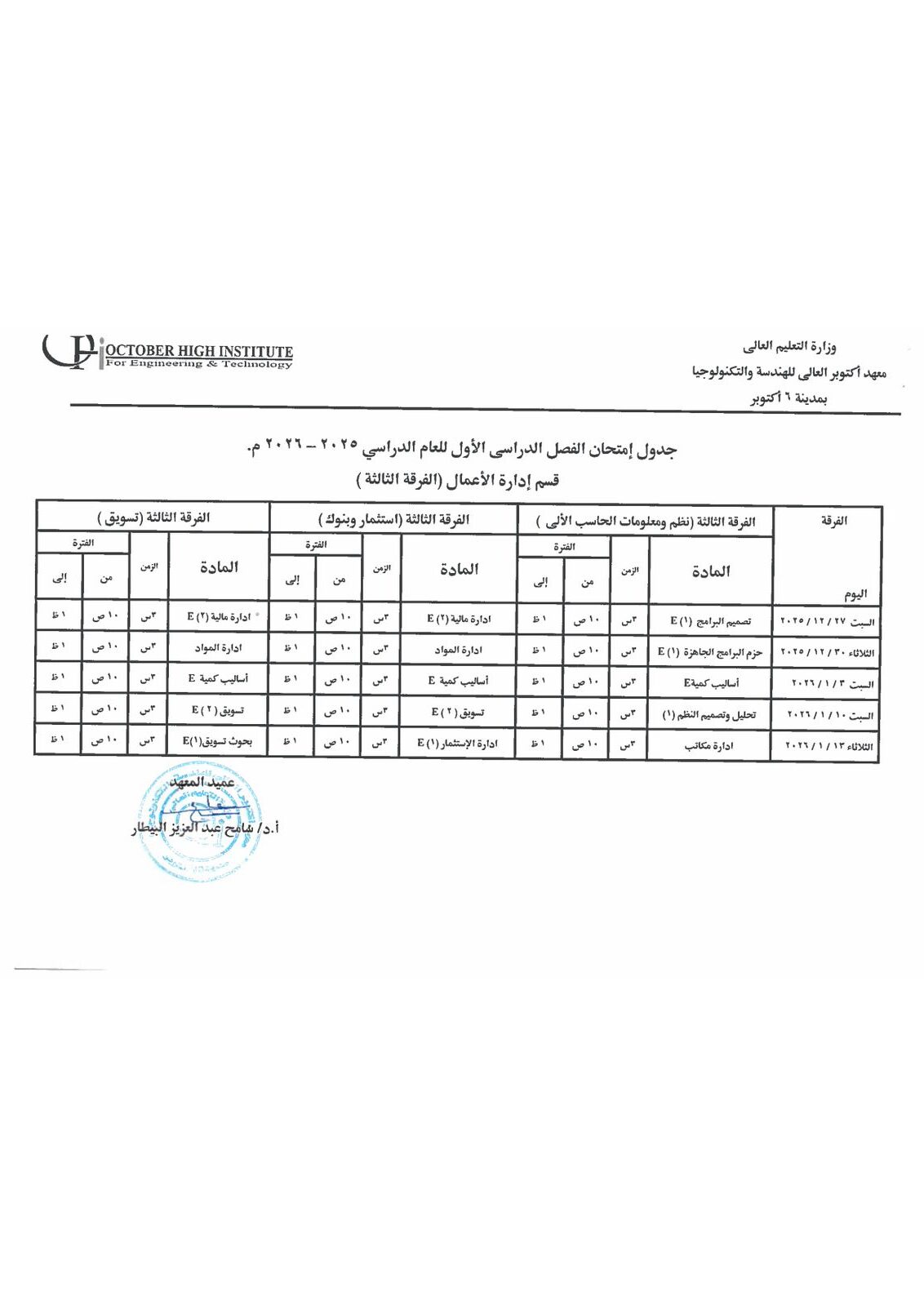 جدول أمتحانات الفصل الدراسي الاول ( هندسة - إدارة أعمال )
