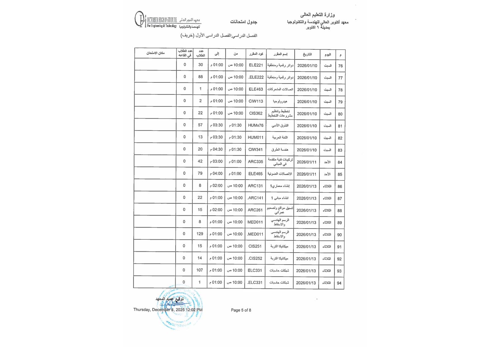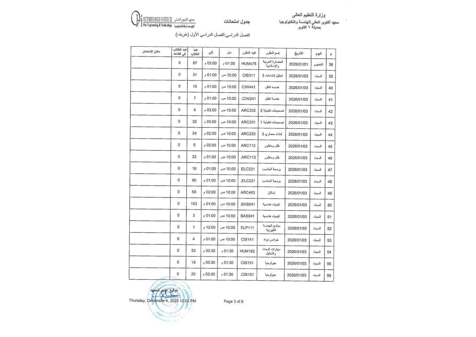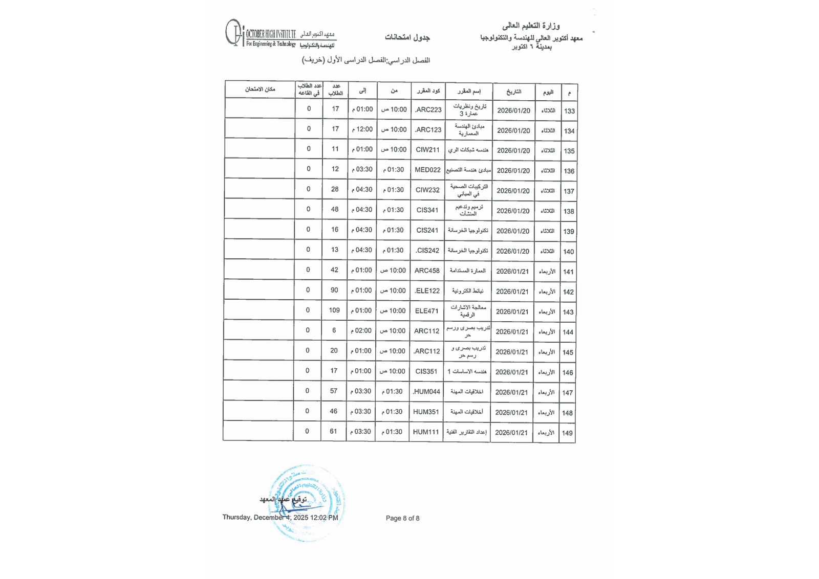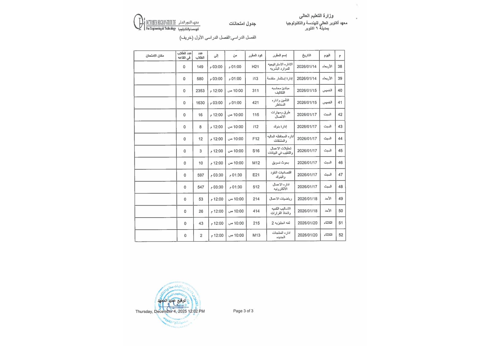 جدول أمتحانات الفصل الدراسي الاول ( هندسة - إدارة أعمال )