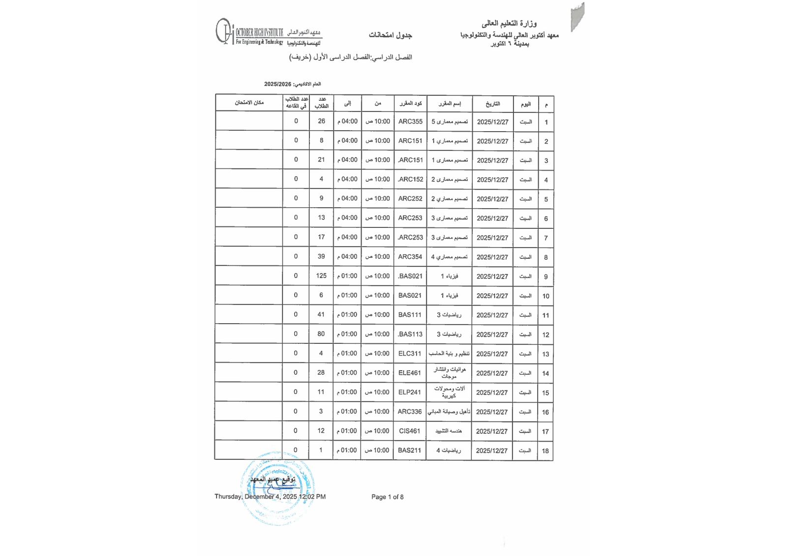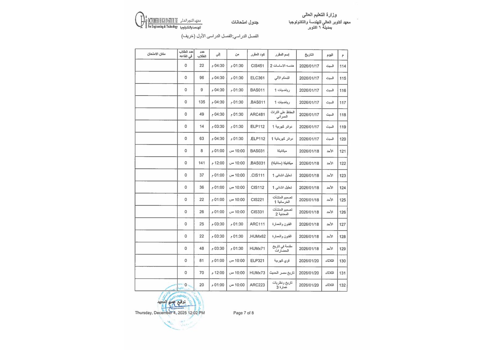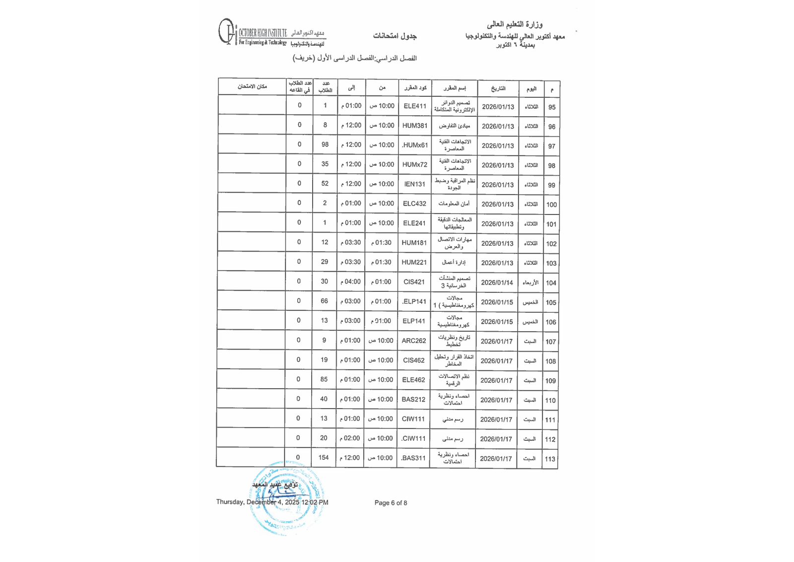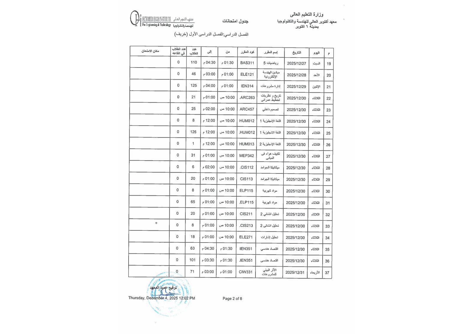 جدول أمتحانات الفصل الدراسي الاول ( هندسة - إدارة أعمال )
