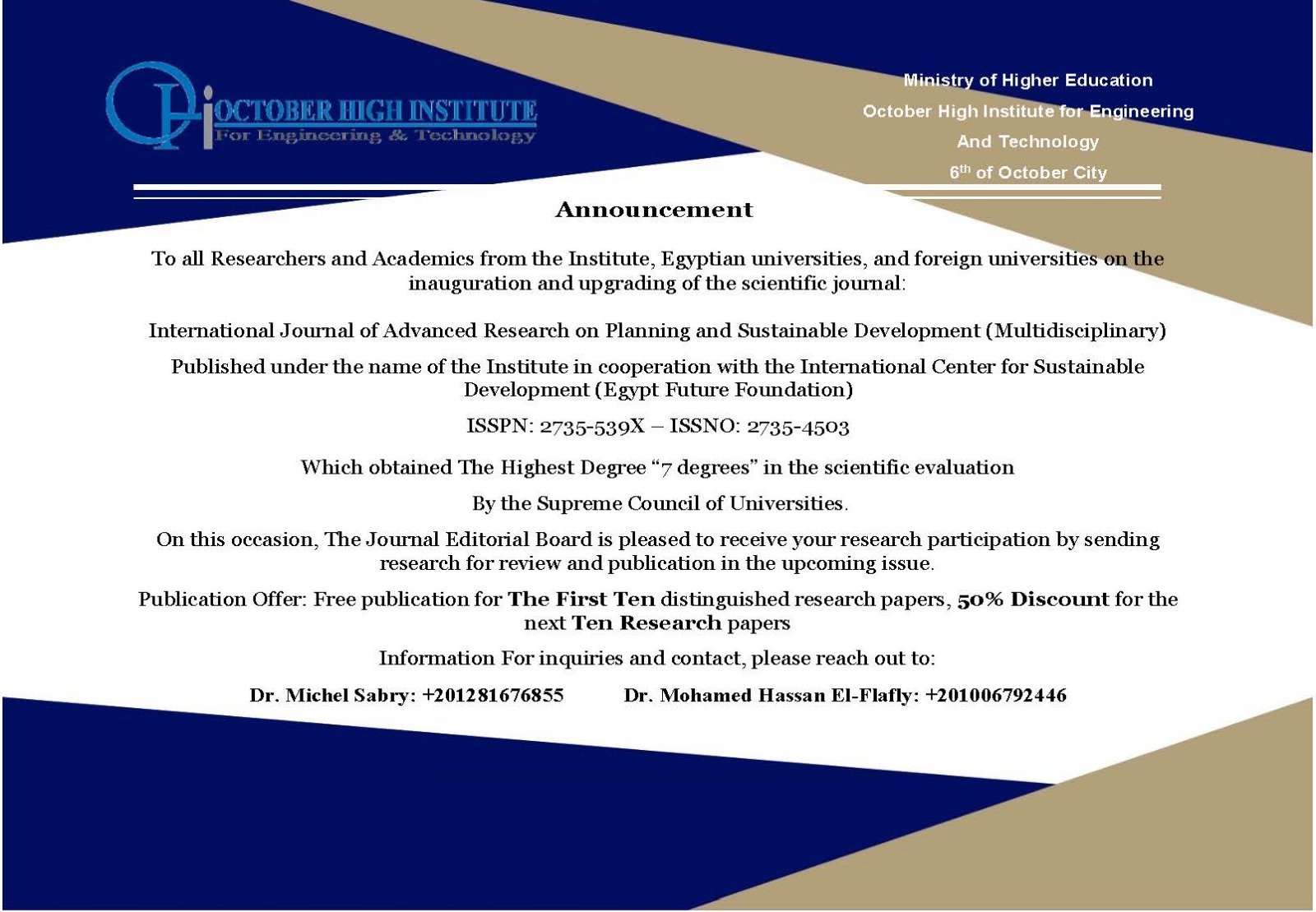 باسم المعهد و بالتعاون مع المركز الدولي للتنمية المستدامة (مؤسسة مصر المستقبل)